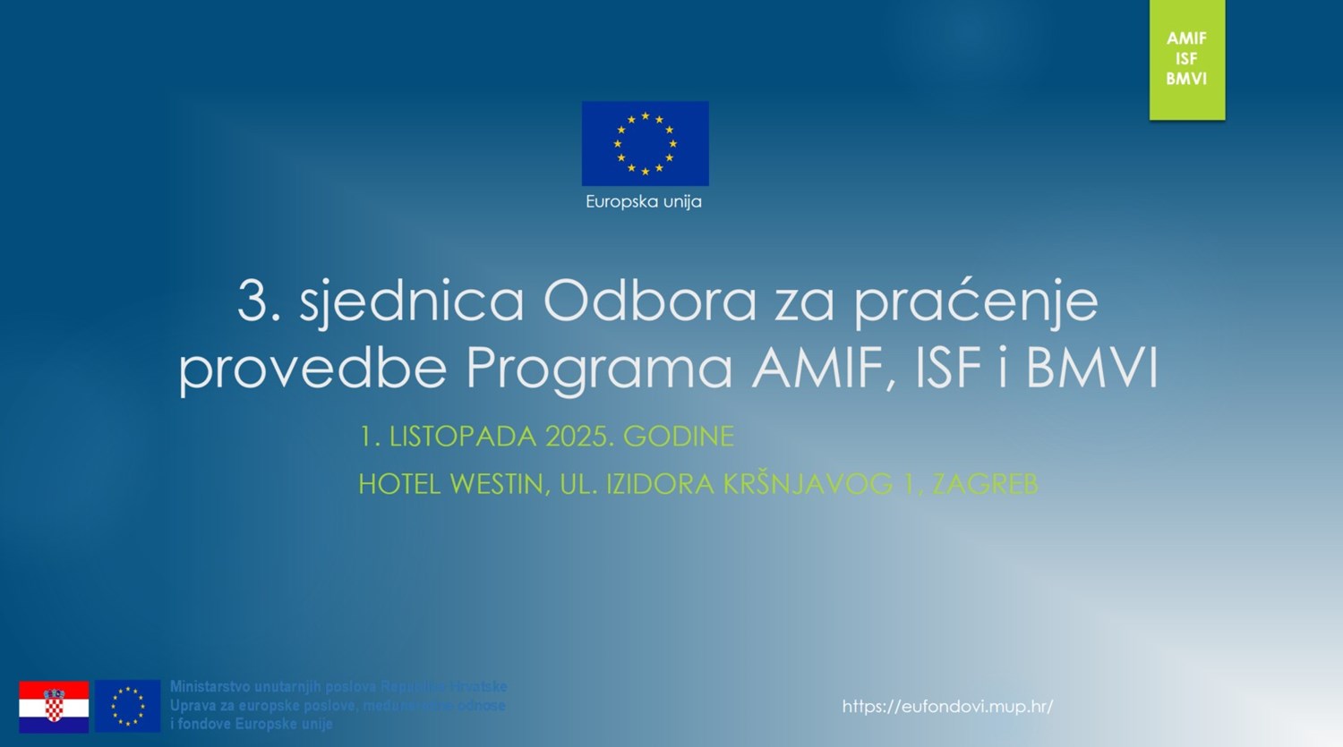 Dana 1. listopada 2025. godine, u hotelu Westin u Zagrebu, održana je 3. sjednica Odbora za praćenje programa fondova za unutarnje poslove u Višegodišnjem financijskom okviru 2021. - 2027. pod predsjedanjem čelnika Upravljačkog tijela, ravnatelja Uprave za europske poslove, međunarodne odnose i fondove Europske unije, g. Dalibora Jurića.